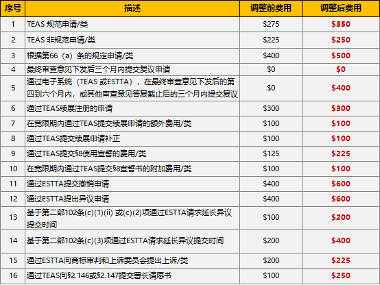 overflow-wrap: break-word !important;">這些提案一旦生效將產(chǎn)生足夠的總收入,可以滿足未來商標和上訴委員會(TTAB)包括相關的管理費用等戰(zhàn)略性運營需求。值得注意的是,自《2021財年國會理由》發(fā)布以來,收費水平一直低于預期,部分原因是COVID-19爆發(fā)導致申請量低于預期,假定的實施日期也不再可用,而本次擬議規(guī)則制定通知(NPRM)中的收入和工作量是基于2021財年國會理由中的預測。本次擬定商標費用變更表: